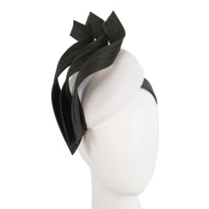 Our milliners created this masterpiece from best materials available. Classic black pillbox, embellished with three jinsin ribbons. It will be a highlight of your Melbourne Cup or any racing event outfit.