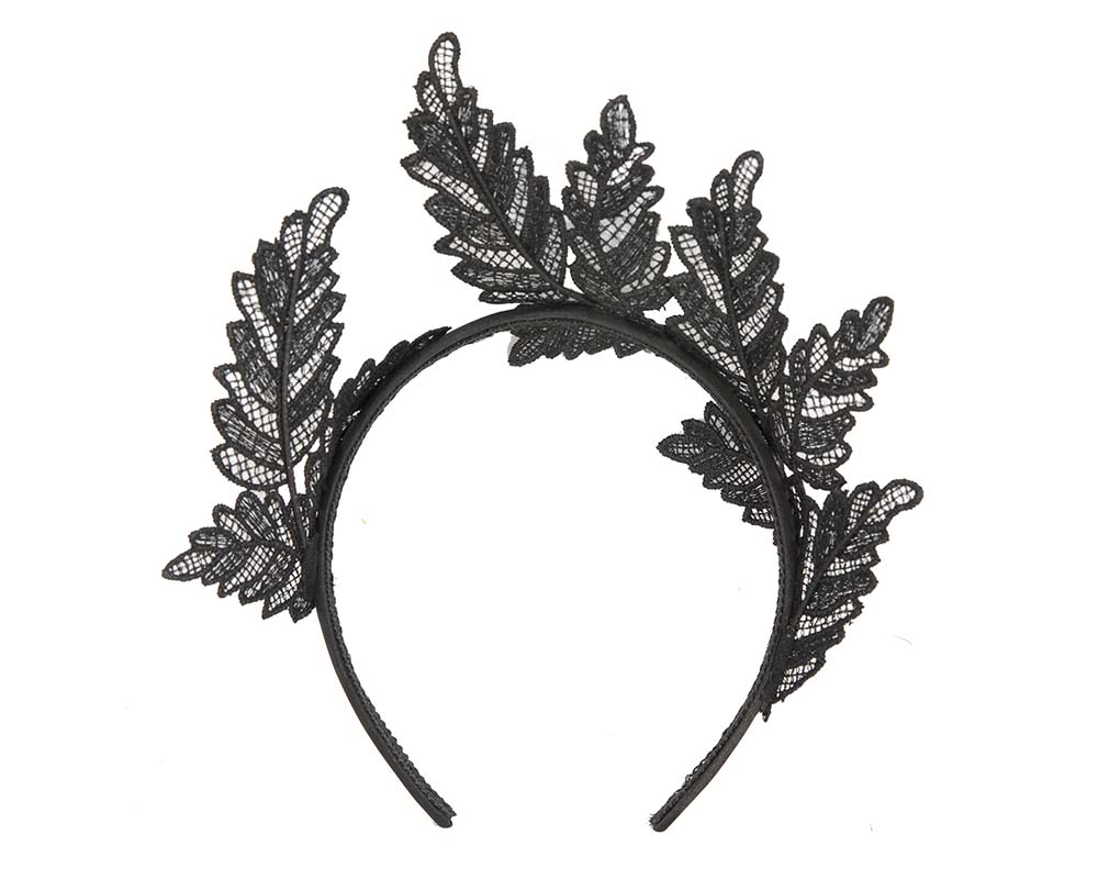 Inspired by roman laurel, this racing crown fascinator is made in Melbourne from luxurious black lace and placed on the headband for easy wear.