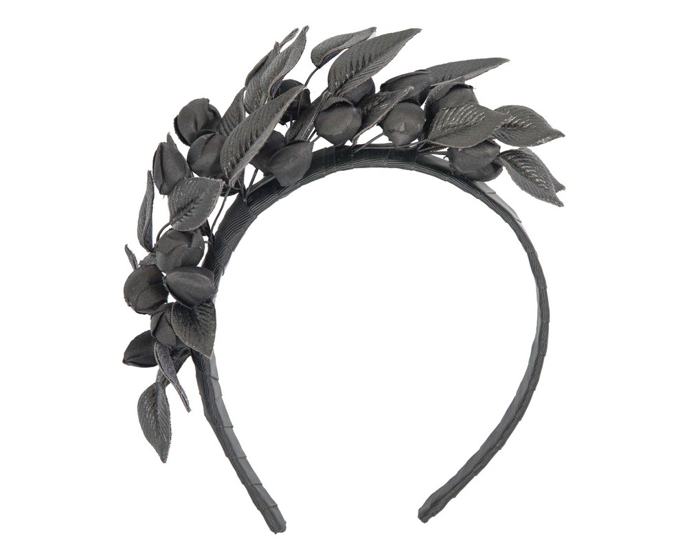 Feminine design black headband. Each leaf and flower bud is hand crafted from faux leather to create unique look.