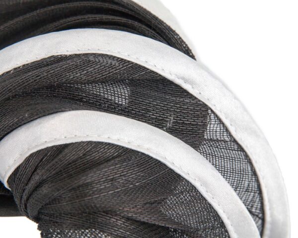Our milliners created this tall headpiece from twists of black abaca fabric with contrast white outline and placed on the headband for easy wear.