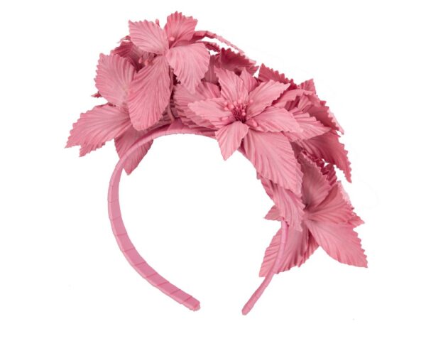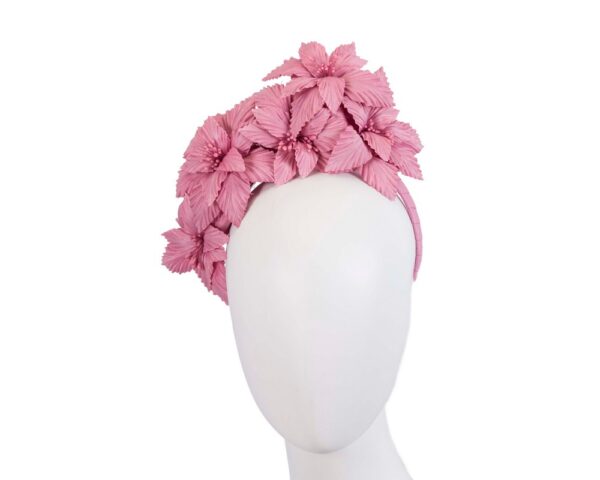 Feminine design dusty pink headband hand made from blocked fabric flowers and placed on the headband.