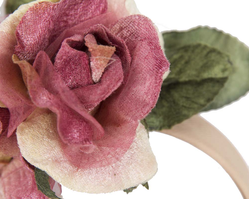 Hand-made silk and velvet roses arranged into a beautiful flower headband fascinator.