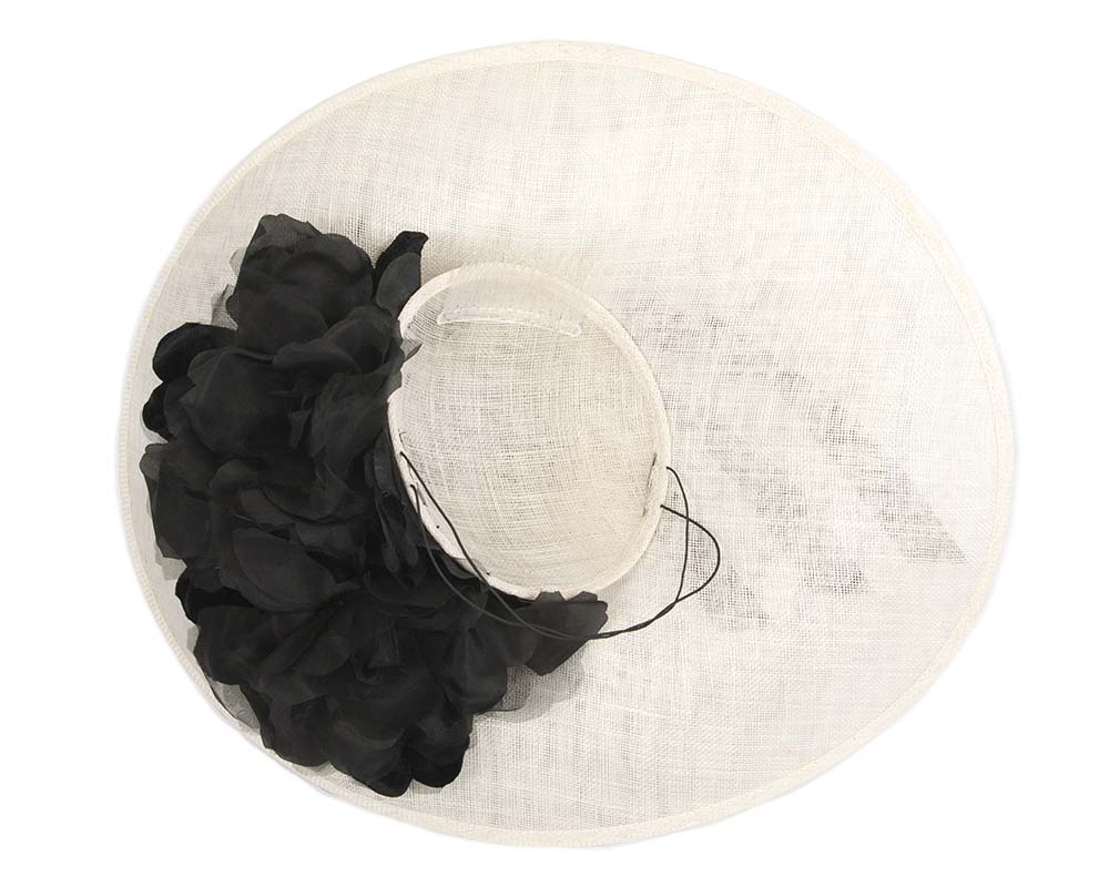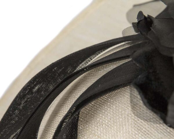 Latest Fillies Collection racing fascinator. Large cream sinamay plate, topped with hand-made black silk flowers, this fascinator will turn heads when you wear it at Melbourne Cup, Ascot or your local racing event.