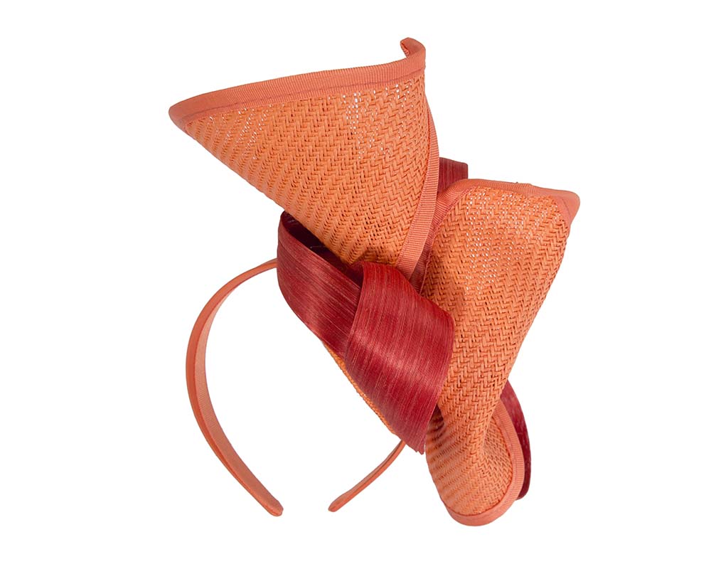 Large orange twisted plate decorated with silk abaca bow. Hand made in Melbourne by our skillful milliners, this headpiece will be a crown jewel of your spring racing outfit.
