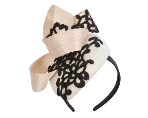 Stunning cream pillbox covered with luxurious black lace and topped with silk abaca box.