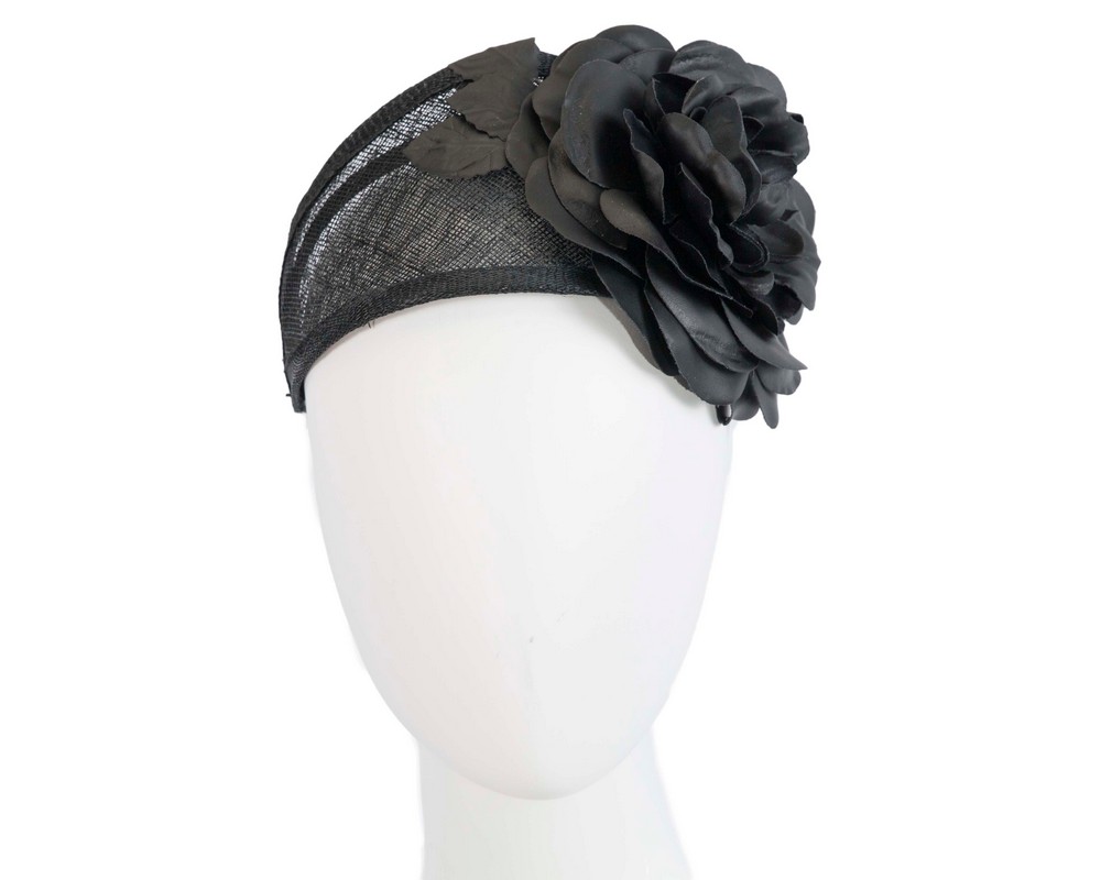 Comfortable wide black sinamay headband with elevated top, decorated with large faux leather rose. Perfect accessory for your next race meeting.