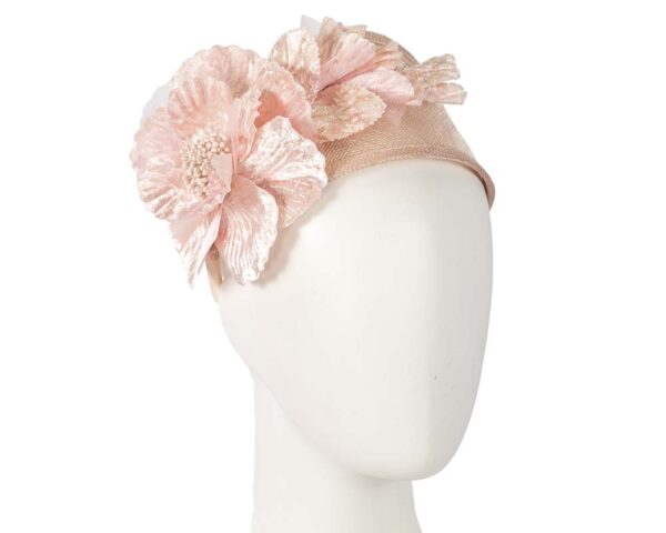 Comfortable wide blush sinamay headband with elevated top, decorated with silk flowers. Perfect accessory for your next race meeting.
