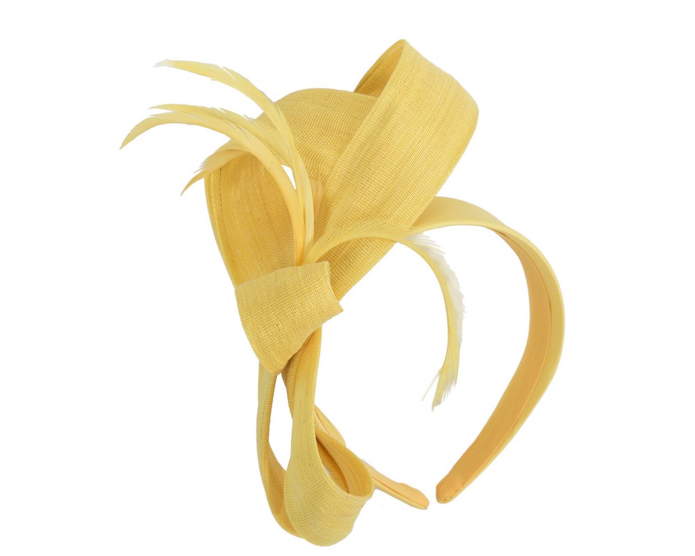 Yellow abaca loops and feathers racing fascinator by Fillies Collection